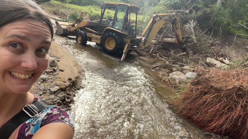 Jayne is still in town borrowing an office and Wi-Fi . As she works I take on the mission to get home. By navigating downed power lines and finding new safer ways to cross the rivers I eventually get to the road leading to our place. It’s buggered. There are sections of road which are no more. Most of the rest is crater filled with massive rocks at all angles. It’s hard enough to hike over. No chance of driving anything. I get to our gate and things look surprisingly well. The rocks are piled high so access is impossible. Looking up the river to the road up to the treehouse is a worry. The corner of our land has been washed out taking down five of our biggest palm trees. They are all well over a hundred-foot-high and their root stacks are vast. There is a huge tangle of fence posts, palm trees, root stacks and barbed wire making it impossible to pass.